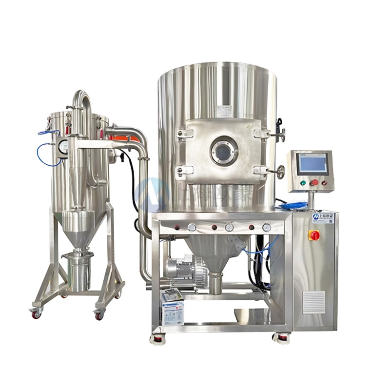喷雾干燥机为开式循环,并流式,离心式雾化。干燥介质空气经过初、中效空气过滤器过滤后根据操作指令由鼓风机吸取再经加热器加热通过高效过滤器的热风分配器进入喷雾干燥主塔。液体物料根据操作指令经过蠕动泵,进入高速旋转的离心喷头,在离心力作用下被分散成小雾滴。在喷雾干燥主塔内,小雾滴与热风在充分接触,沿其特定路径进行热交换后被干燥成为产品,然后通过旋风分离器实现分离,固体物料被收集,气体介质再经过过滤后被排出。整套喷雾系统易清洁、无死角,符合GMP要求。